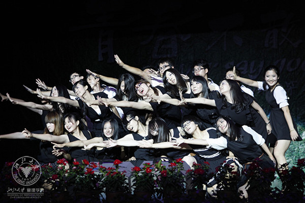 第二篇章,写给你们。收藏青春,生命的网越织越密,大家在浙里相遇,相知,相守,共同挥洒青春。09级财务管理班以一曲明快的歌曲奏响了晚会的第二篇章。他们的《笑傲青春》,有惊喜,有泪水,有坚持,有放弃,这才是大家共同走过的青春,不需要天籁之音,一起走过的时光才是最动人的旋律。一首首熟悉的乐音悄然响起,揭开了09级旅游管理的《爱》的面纱,妙用甄嬛的背景,颠覆的情节、搞笑的对白展示学生调侃生活的才气,赢得全场接连不断的欢笑与掌声,旅管女生带来的西域风情舞蹈更是惊艳出场,整个小剧场沸腾了,精彩的表演让同学们大饱眼福。之后由农林经济管理带来的的短剧《找你妹》刻画了90后大学生的张扬个性与不羁情怀。学生代表向管理学院献礼――由全体毕业生绘制而成的管院缩影,象征着今后无论天南海北,管院的高大形象永远留在学子们心里。一个个彩色的手印则表达了2013届毕业生对学院留恋和归属的情怀。虽然离开了管院,但他们的心永远与管院紧紧相连。