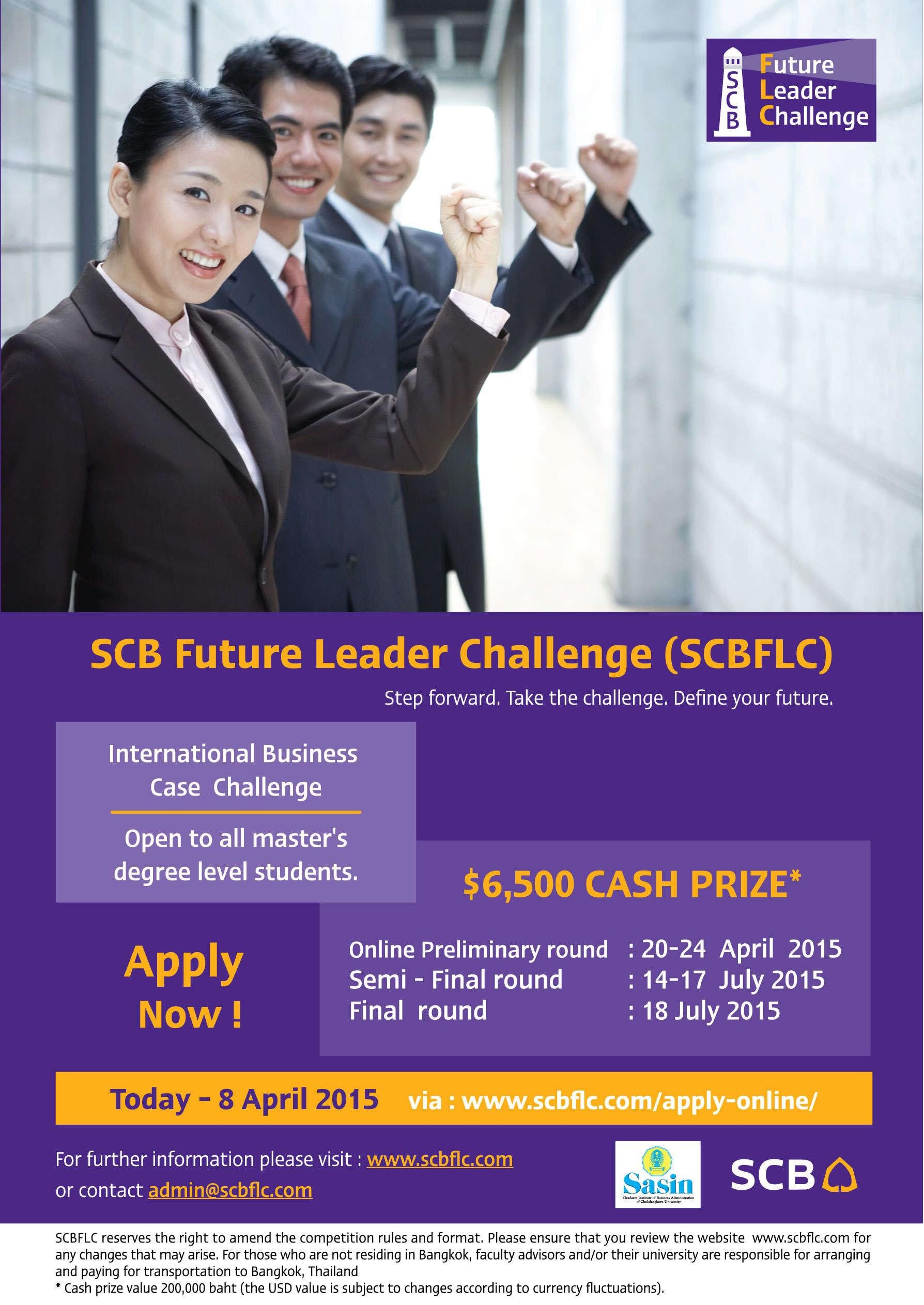 2015SCB未来领袖挑战—商业案例大赛现已启动!此次大赛是由Siam商业银行和Chulalongkorn大学Sasin工商管理研究生院合作第一次在泰国举办的全球商业案例比赛,旨在共同推进下一代商界领导者的潜能开发,提供一个快速、深刻了解顶级跨国公司的学习平台。快节奏的比赛,要求参赛者不但要具备商业知识,还要有将课堂理论转化为实际解决方案的能力。参赛者将要面对由各商界领袖、行业专家和专业学者组成的评委团。在本次大赛中,学生们不仅可以获得在各大公司的进一步发展、扩大全球联络网的职业机遇,还将有机会获得高达6500美金的奖励。