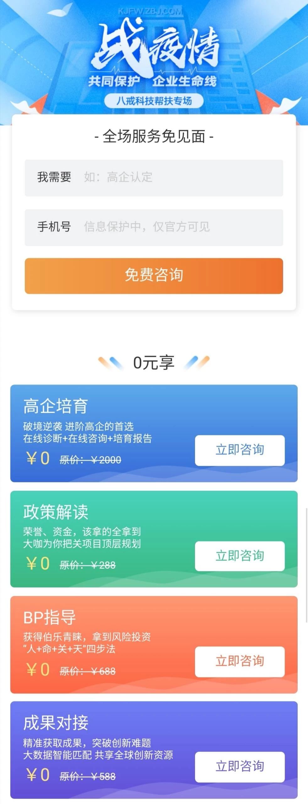 为方便企业及时享受福利补贴,科技咨询服务平台设立战疫情帮扶专场。免费提供高企培育、政策解读、成果对接、BP指导等服务,同时还可免费对接专家人才、技术创新及投融资等服务。