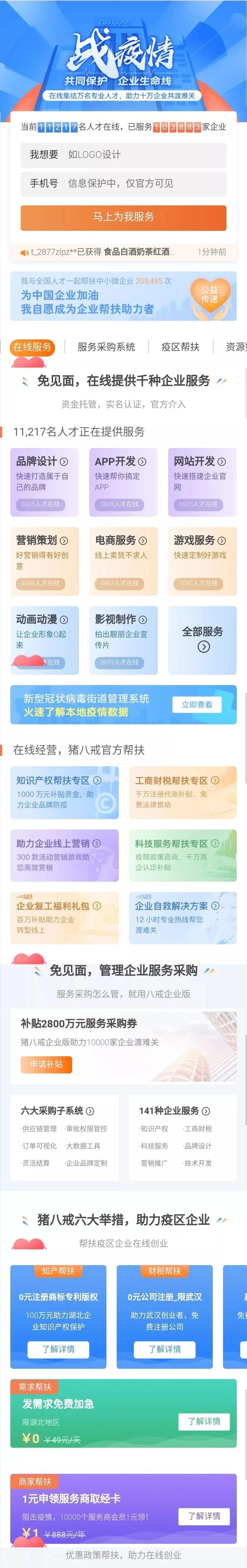 在由浙大管院华中生教授作为主持人的国家重点研发计划“基于模式创新的科技咨询服务平台”项目(2018YFB1403600)支持下,猪八戒网发起“战疫情-共同保护企业生命线”行动,集全平台之力,发布服务商招募令,集结10000名专业人才为10万家企业提供“免见面服务”,助力企业在线复工生产减少经济损失。