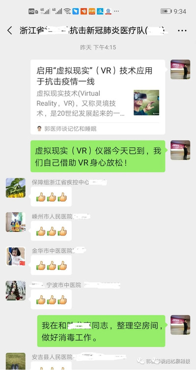 2月22日,郭忠伟在医疗队的微信群发出消息:虚拟现实(VR)仪器今天已送到,我们自己借助VR身心放松!队员们听说后,纷纷在群内排队接龙报名。治疗开始前,浙江省疾控中心专家陆龙喜对治疗室进行了消毒和感控管理。