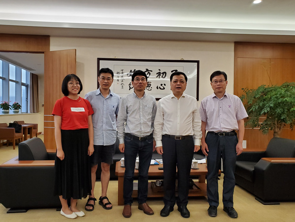 WB官网党委书记朱原(右1)、教授邬爱其(左3)、副教授章重远(左2)赴正泰集团调研并与南存辉先生(右2)合影