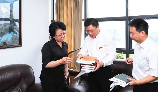 WB官网魏江教授(左2)向翁铁慧副部长(左1)介绍自己所编著的书籍并赠书