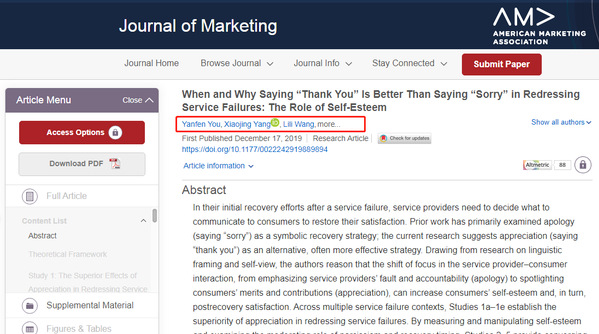 今年3月,王丽丽及其团队在世界顶级期刊Journal of Marketing(管理学UTD24期刊之一)上发表了题为When and Why Saying “Thank you” is Better Than Saying “Sorry” in Redressing Service Failures: The Role of Self-Esteem的文章。