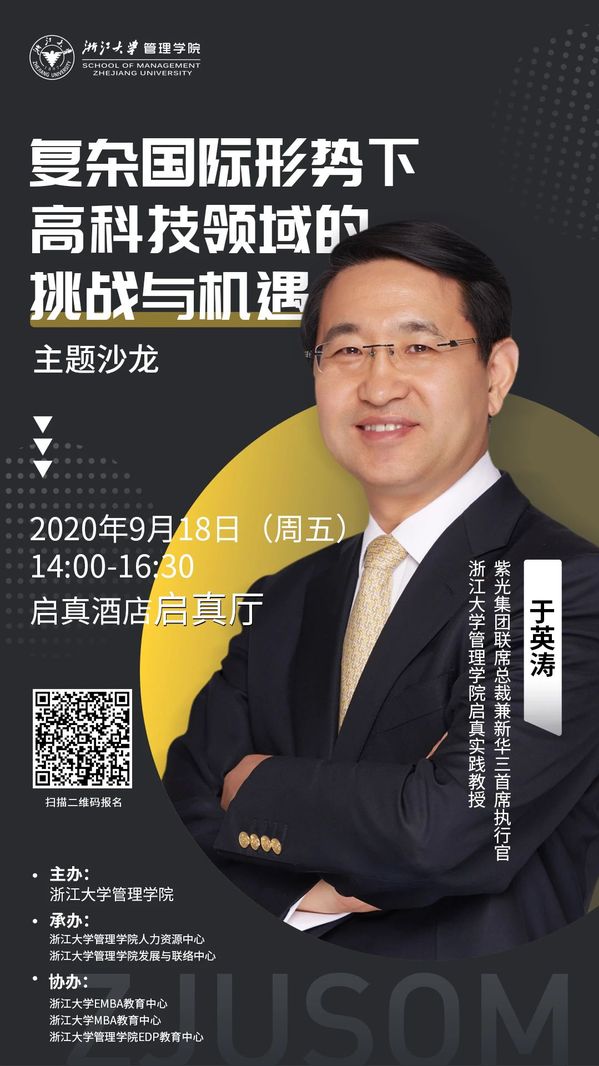 作为浙大管院落实开放办学理念、“与一流企业/企业家同行”和构建“商学+”生态系统的举措,浙大管院还将邀请于英涛为师生带来一场关于“复杂国际形势下高科技领域的挑战与机遇”的演讲。