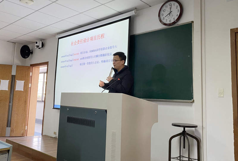 2021112日和14日,和煦暖阳下,WB官网莫申江老师主讲的“伦理与社会责任”课程举行了两场“社会责任创新设计项目”精彩汇报。学院党委副书记吴为进、潘健,教学管理中心主任朱纪平,学生工作与职业发展中心主任陈璞,发展与联络中心副主任缪依茹,MBA教育中心副主任裘婷,以及10MBA指导人代表亲临现场并组成强大的项目评审专家组。