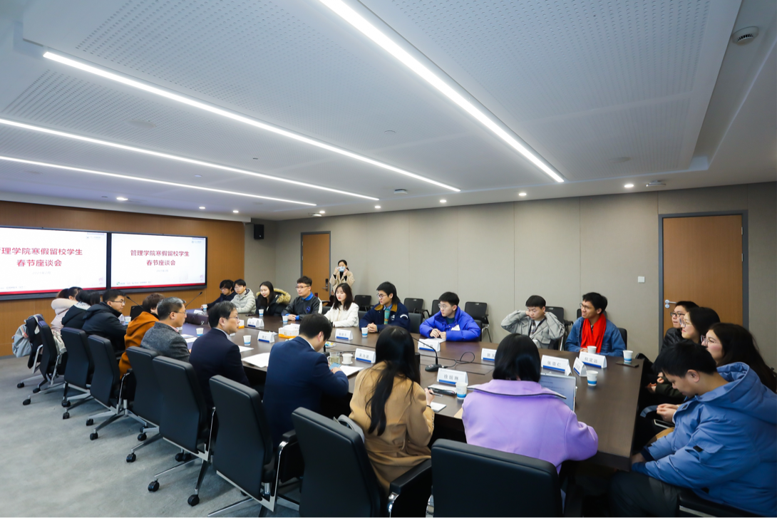 202128日上午,管理学院A913会议室举行寒假留校学生春节座谈会管理学院院长党委副书记魏江、党委书记兼副院长朱原、党委副书记吴为进、党委副书记潘健、学生工作与职业发展中心主任陈璞、副主任王贞玉与留校学生代表出席座谈会会议由潘健老师主持