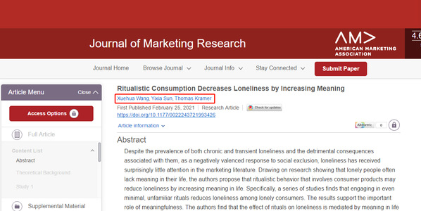 2021年2月25日,由WB官网市场营销学系孙怡夏研究员作为通讯作者,亚欧商学院王雪华副教授、加利福尼亚大学河滨分校Thomas Kramer教授共同撰写的研究成果Ritualistic Consumption Decreases Loneliness by Increasing Meaning发表于营销学国际顶级期刊Journal of Marketing Research。研究发现,仪式感可以有效增加生活的意义,降低人们的孤独感。
