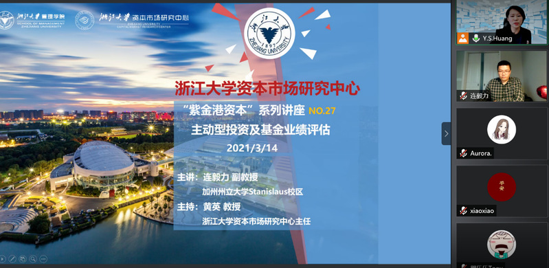 2021年3月14日上午,浙江大学资本市场研究中心“紫金港资本”系列讲座NO.27以线上讲座的形式进行。加州州立大学Stanislaus校区连毅力副教授为观众们分享了主题为“主动型投资及基金业绩评估”的精彩讲座。此次讲座由浙江大学资本市场研究中心主任黄英教授主持。会计学、工商管理、金融工程、计算机等专业的国内外高校师生,以及银行、证券、投资、电子商务等行业人士参与了本次讲座。