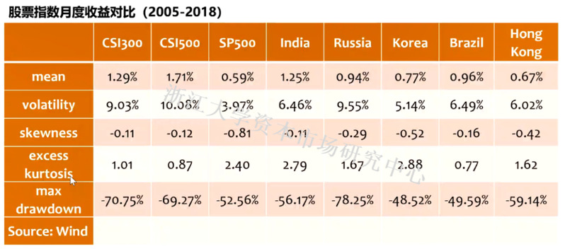 从表中可以看出,沪深300的平均收益大概是标普500的三倍;而沪深300的波动率也是非常大的。在中国的市场上,存在较大回撤幅度的可能性,但收益和波动率整体上是匹配的。
