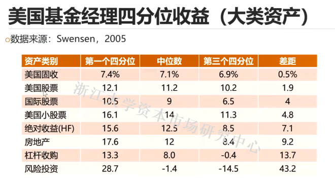 美国固收的上下四分位的差距只有0.5% ,对于此类型最好做被动型投资,因为付出的努力最大的回报空间只有0.5%;而风险投资收益的中位数是负的,但如果能分辨出项目的好坏,最大的收益可以达到43.2%。