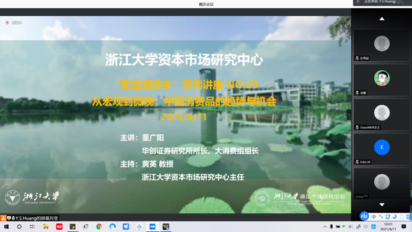 2021411日上午,浙江大学资本市场研究中心“紫金港资本”系列讲座NO.29以线上讲座的形式进行。华创证券研究所所长、大消费组组长董广阳先生为观众们分享了主题为“从宏观到微观:中国消费品的趋势与机会”的精彩讲座。此次讲座由浙江大学资本市场研究中心主任黄英教授主持。会计学、工商管理、信息管理与信息系统等专业的国内外高校师生,以及银行、证券、投资、电子商务等行业人士,合计200余名观众线上参与了本次讲座。