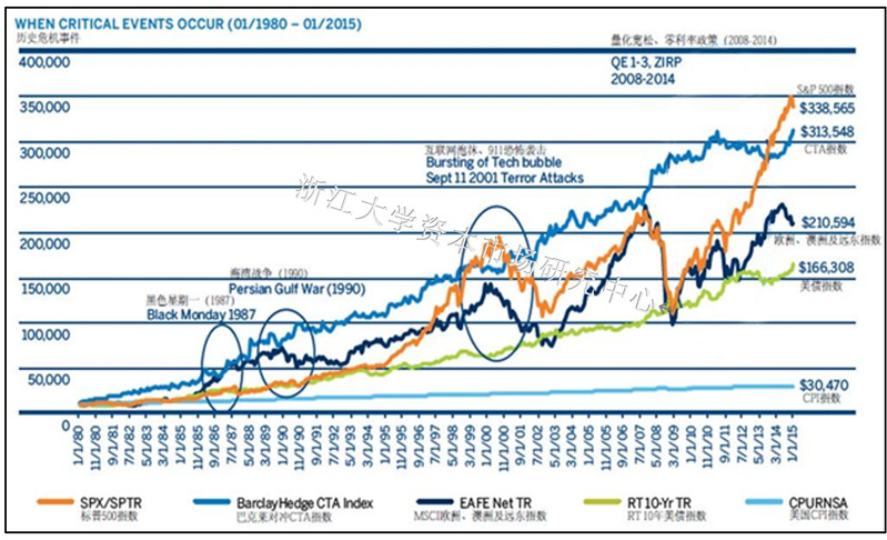 从下图可以看出,巴克莱对冲基金CTA指数(蓝色)在历史历次危机爆发中表现平稳,CTA基金可以有效对冲尾部风险事件,作为多元化分散投资工具,有很高的防御性。