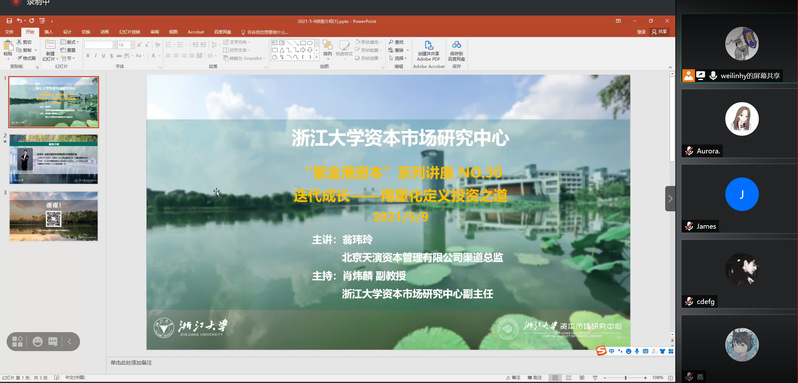 2021年5月9日上午,浙江大学资本市场研究中心“紫金港资本”系列讲座NO.30以线上讲座的形式进行。北京天演资本管理有限公司渠道总监翁玮玲女士为观众们分享了主题为“迭代成长——用量化定义投资之道”的精彩讲座。此次讲座由浙江大学资本市场研究中心副主任肖炜麟副教授主持。会计学、工商管理、信息管理与信息系统等专业的国内外高校师生,以及银行、证券、投资、电子商务等行业人士,合计100余名观众线上参与了本次讲座。