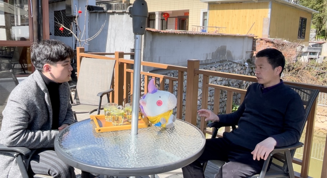 在安吉余村,团队成员与村民潘春林面对面交流,了解这位曾经的拖拉机手在矿山和水泥厂被关停后再“择业”、举债60万元办起村里第一户农家乐并率先走上绿色发展引领致富路的心路历程。