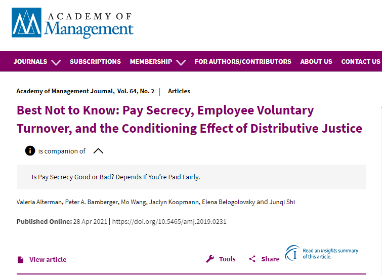 研究以“保密工资制与员工自愿离职:分配公平的调节作用(Best Not to Know: Pay Secrecy, Employee Voluntary Turnover, and the Conditional Effect of Distributive Justice)”为题,在国家自然科学基金(批准号:71425004)资助下完成。研究中,施俊琦与合作者基于不确定性管理理论(Uncertainty Management Theory),探讨了组织中工资保密制在个体层面、组织层面的影响和关键边界条件,旨在为组织中人力资源管理实践提供学术依据。2021年4月28日,该研究成果发表于国际顶级期刊《美国管理学会学报》Academy of Management Journal。