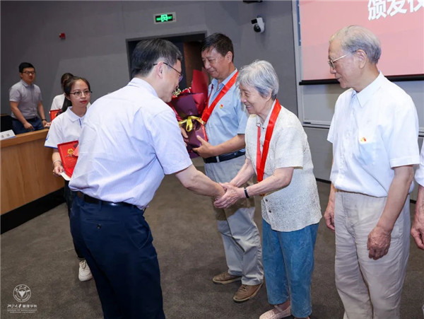 本次管理学院共有10位老党员荣获“光荣在党50年”纪念章,他们分别是谭仁甫、王春祥、徐秉文、谢敦礼、石瑛、陈天来、胡介埙、翁贤明、周耀烈、王如芳。校离退休工作处副处长兼离休党工委副书记李民、管理学院党委书记朱原为7位与会老党员颁发纪念章,并送上鲜花。