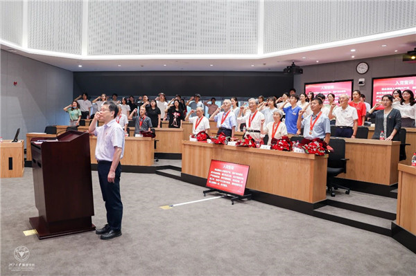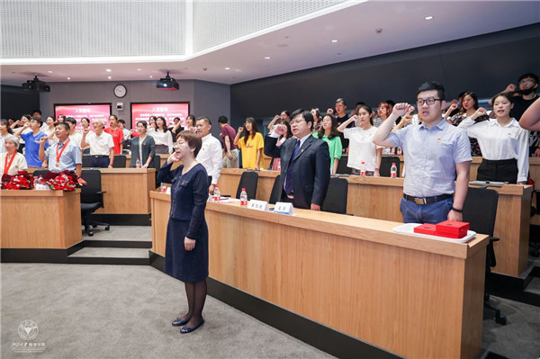 在党旗见证下,由浙大管院党委书记朱原领誓,党龄50年以上的老党员们和教工党员代表重温入党誓词,新发展党员进行入党宣誓。