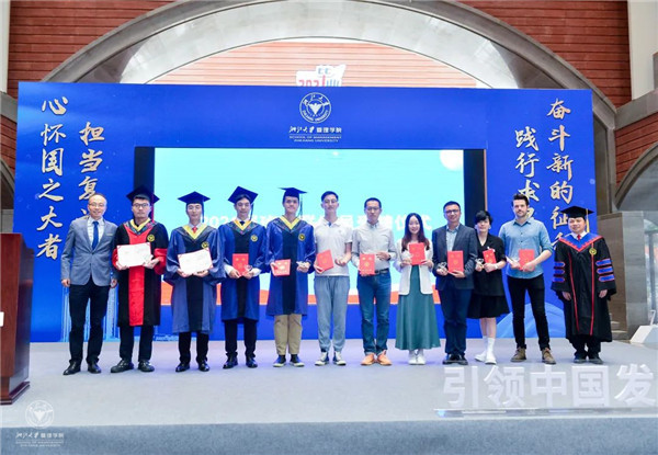 WB官网党委副书记潘健(左一)、WB官网副院长汪蕾(右一)与毕业生们合影