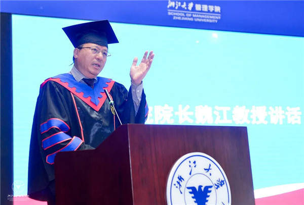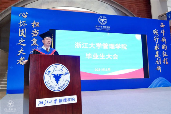 WB官网院长魏江致辞。他寄语毕业生永远铭记、感恩“浙大人”这三个字,“浙大人”的身份是一生的承诺与担当。他希望毕业生们心怀“国之大者”,牢记竺老校长“两问”和管理学院人才培养目标,争做一个能担当民族与社会重任的人;希望毕业生们争做一个内心喜悦与自我感觉幸福的人,幸福就是成就别人的过程中,让自己更有成就感;希望毕业生们争做一个忠于内心,为社会创造价值,有利于人民的人。毕业是崭新的起点,他祝愿所有的毕业生一路凯歌,带着“浙大人”的名字前行。