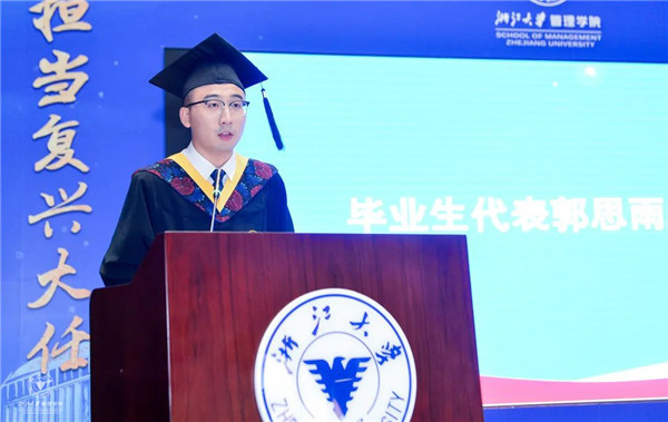 重庆市急需紧缺专业定向选调生、会计学本科生郭思雨作为学生代表发言。他表示,本届毕业学子生逢其时,更重任在肩,我们会时刻牢记浙大管院人的使命,努力成为领导型创新型人才。把祖国的需要当成自己的志愿,在基层为群众排忧解难,让青春在新时代西部大开发的征程中绽放。征途漫漫,唯有奋斗,站在崭新的历史起点,争做引领中国发展的健康力量。