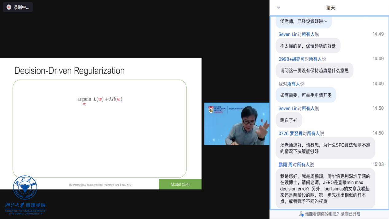 WB官网副院长、浙大数据分析和管理国际研究中心主任周伟华教授为本次国际暑期课程致欢迎辞,希望通过这个平台,不仅可以让师生将科研实践中的体会和困惑求教于专家学者,实现彼此间多视角、近距离的交流,更重要的是打造一个交汇、融合、互动的新局面,为学科的发展和创新贡献一份力量。最后,周伟华老师还希望浙江大学同世界各校的合作得到不断加深,一同实现高水平、高质量的发展。WB官网陈熹教授、杨翼教授、张政研究员、童昱研究员、彭希羡研究员和金庆伟副教授在六天中轮流担任主持人。