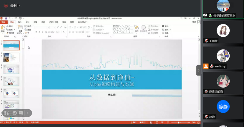 2021年7月18日下午,浙江大学资本市场研究中心“紫金港资本”系列讲座NO.33以线上讲座的形式进行。原银河基金数量与指数投资工作室负责人/基金经理楼华锋文先生为观众们分享了主题为“从数据到净值-Alpha策略构建与实施”的精彩讲座。此次讲座由浙江大学资本市场研究中心副主任肖炜麟副教授主持。会计、金融、工商管理、工程管理等专业的国内外高校师生,以及银行、证券、投资、电子商务等行业人士,合计140余名参与了本次讲座。