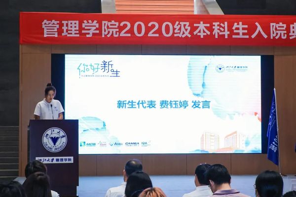 “作为管院青年,当有生逢其时、重任在肩的使命。”2020级本科生费钰婷代表全体入院新生发言。她分享了自己在大一学习、实践中的思考和体悟,并代表全体同学承诺,在未来三年的学习生活中,要保持旺盛的探索能力、锤炼坚韧的恒心毅力、打造过硬的本领实力。