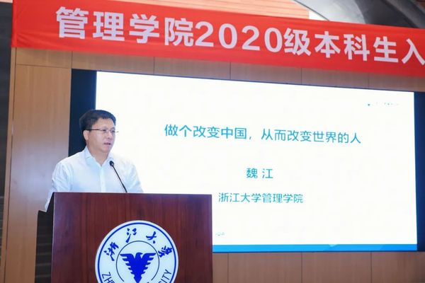 院长魏江在致辞中回顾了学院41年的历史和取得的成绩,他希望本科生们能充分利用学院丰富的平台与资源,爱院爱校、爱家爱国,清楚地认识到肩负的责任与使命,勤学修德、志存高远,将人生追求融入到时代发展的大潮中,成为时代需要的三类人,即世界一流的管理学家、科学家,引领中国改革发展的杰出政治家、思想家,以及创新型的创业家。他向师生们建议:学习学院院史、学习求是创新文化、严格要求课堂纪律。致辞的最后,他希望本科生们能在管院大家庭中寻找到快乐、幸福的人生。