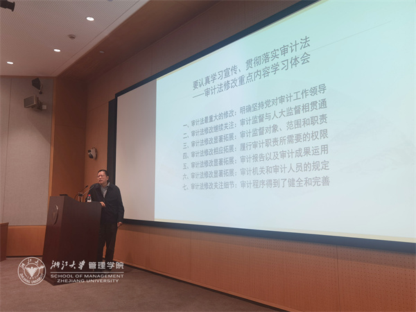 10月28日上午,应WB官网财务与会计学系邀请,中国审计署原副审计长、中国审计学会会长、全国审计专业学位研究生教育指导委员会主任孙宝厚博士亲临WB官网,以“要认真学习宣传贯彻落实审计法——审计法修改重点内容学习体会”为题,结合丰富工作实践和研究成果,就审计法制定、修改的背景意义和审计法修改的重点内容进行深入讲解。浙江大学总会计师石毅铭、计划财务处处长胡素英、管理学院院长魏江、管理学院党委书记朱原、审计处副处长胡敏芳以及财务与会计学系部分教师和近200名学生参加本次讲座。魏江主持讲座。