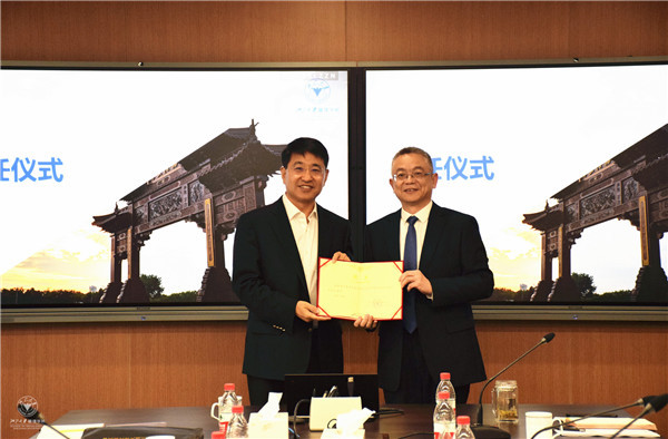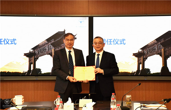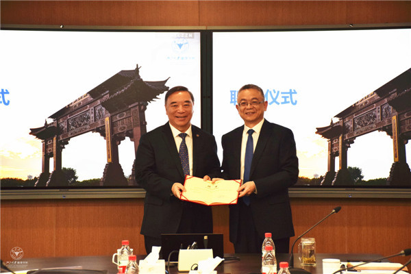 浙江大学党委副书记傅强为于英涛(左)颁发聘书