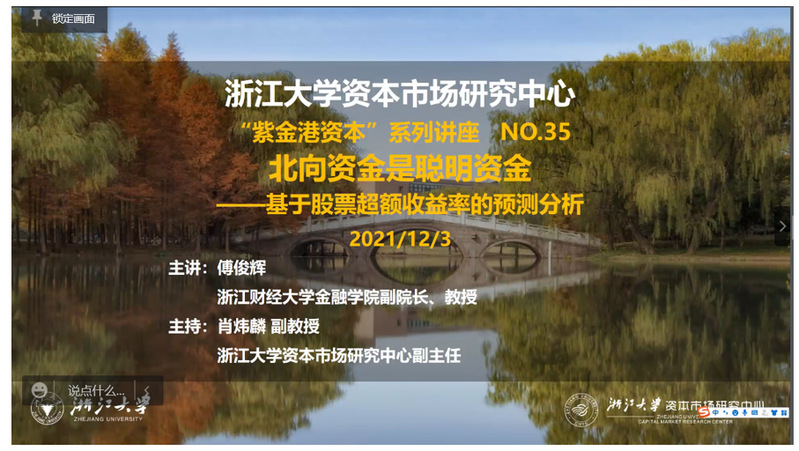 12月3日下午,浙江大学资本市场研究中心“紫金港资本”系列讲座第35场于线上举行。浙江财经大学金融学院副院长傅俊辉教授作“北向资金是聪明资金——基于股票超额收益率的预测分析”主题分享,共吸引高校会计、金融、工商管理、工程管理等专业师生,以及银行、证券、投资、电子商务等行业的从业人员等110余人在线参与。讲座由浙江大学资本市场研究中心副主任肖炜麟主持。