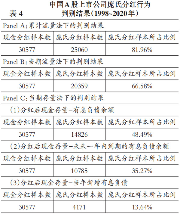 ⑭谢德仁等(2020)也在累计流量法下发现在进行现金分红的公司中有87%的公司存在庞氏分红行为,与本文的研究结果一致。