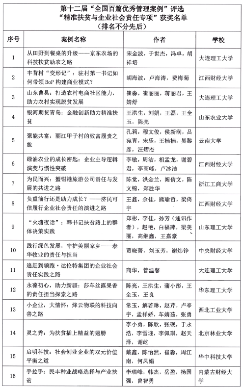 自2021年9月13日启动,此次专项评选共收到来自全国87所院校的219篇投稿。经过两轮专家评审,最终确定32所院校的38篇案例入选。全国工商管理专业学位研究生教育指导委员会决定对第十二届“全国百篇优秀管理案例(精准扶贫与企业社会责任专项)”作者予以表彰。
