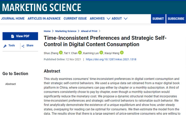 数字化时代,网络小说消费非常普遍,据相关报告显示,目前中国有超过4亿独立读者在为某种形式的网络小说付费。基于如此广泛存在的网络小说消费行为,王小毅团队研究数字内容消费行为及其自我控制策略,提出对消费者和企业都受益的批量附加费定价计划,抑制过度消费行为,极具理论与应用价值。不只是在网络小说消费领域,他们在研究中提出的建模方法和结果还可推广至其他消费环境,甚至包括香烟和酒类消费。同时,他们的研究对公共政策制定者、数字内容生产者和发行商也都有着实质性影响。