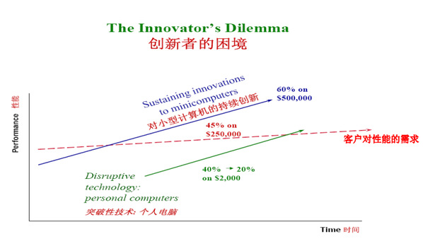下面我们通过这张图来看。如下图所示,如果你是一家卖小型计算机企业的管理者,以客户为中心,管理也非常完善,当你不停问客户需要什么样的小型计算机时,客户一定会说,我想要这样那样的性能,然后你开始研发……大家看下面这条蓝线,表明服务你的主要客户持续在小型计算机赛道上做性能的改进。而你的客户绝对不会说需要个人电脑,因为当时的个人电脑满足不了客户对于储存、计算性能的要求,但个人电脑的技术也有公司在发展演进(绿线所示),所以有一天,当客户对性能的需求(红线)跟个人电脑突破性技术(绿线)相交的时,做小型计算机业务(蓝线)的公司就没有生意做了,因为小型计算机的客户都去买个人电脑了,这就是颠覆性创新。而如果公司没有人看绿线的业务,你的公司就会被颠覆,这就是克里斯坦森教授的理论。