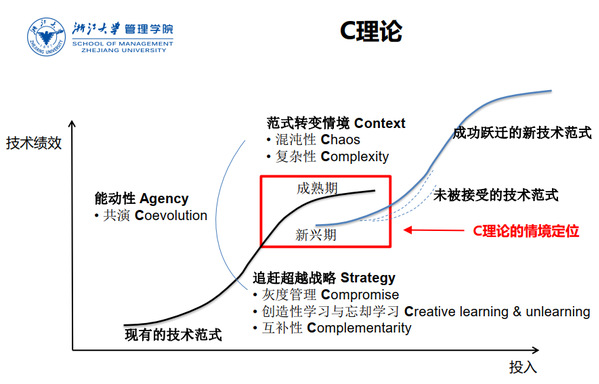 通过研究,我们提出了几个关键词,首先你要承认范式转变情境的复杂性与混沌性,而要在范式转变情境下成功实现追赶超越,需要灰度管理 (Compromise),需要创造性学习与忘却学习(Creative learning & unlearning),需要互补性 (Complementarity)。其实有时候忘记比学习更难,因为你要忘记的知识存在于人的脑海,存在于团队的惯性思维中,存在于团队带领者的职业生涯里。所以,忘却学习,可能要求你换掉这个人,换掉这个团队。因为当时我们总结的这些词都是以C开头,所以我们提出了基于中国发展情境的本土原创管理理论——C理论。