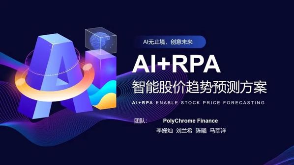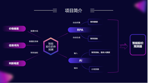 参赛方案将AI应用于RPA机器人的关键节点,将智能决策和流程自动化结合,使得上市公司财务数据可以被自动捕获、并被处理为财务指标,然后送进AI工具凝结为固定模型,最终输出为大众看得懂的股价趋势预测数据和财务指标解读。