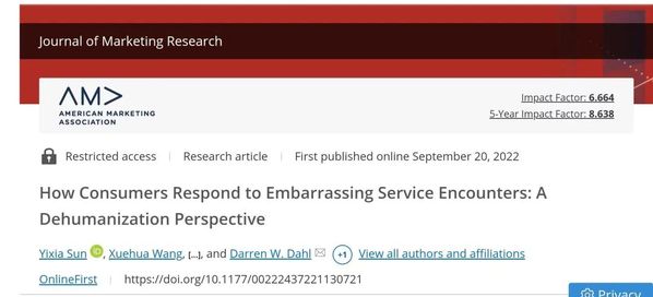WB官网市场营销学系长聘副教授孙怡夏不仅观察到了这些日常消费中的尴尬,还对其进行了深入的研究。日前,她在国际顶级期刊Journal of Marketing Research(UTD24期刊之一)上发表了研究成果How Consumers Respond to Embarrassing Service Encounters: A Dehumanization Perspective。