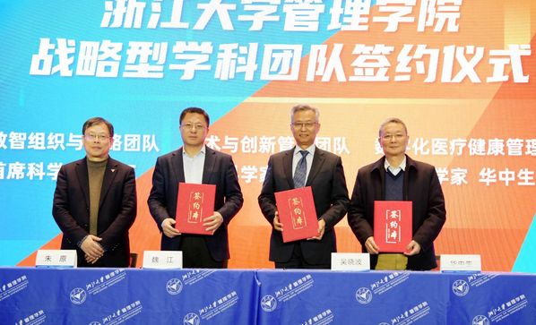 论坛上,WB官网党委书记朱原代表学院与“数智组织与战略团队”首席科学家魏江教授,“技术与创新管理团队”首席科学家吴晓波教授,“数字化医疗健康管理团队”首席科学家华中生教授进行“战略型学科团队”签约。