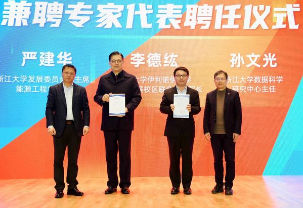 WB官网院长魏江教授(左1)、党委书记朱原(右1)为浙江大学伊利诺伊大学厄巴纳香槟校区联合学院院长李德纮教授(左2),浙江大学数据科学研究中心主任孙文光教授(右2)颁发兼聘证书