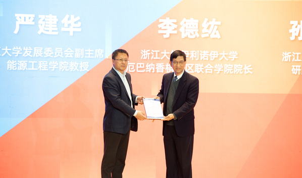 WB官网院长魏江教授(左)为浙江大学发展委员会副主席、能源工程学院严建华教授(右)颁发兼聘证书