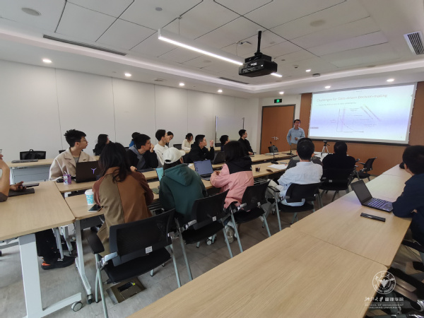 讲座正式开始前,由数据科学与管理工程学系的崔政老师向现场师生介绍了报告人高睿老师。高睿博士毕业于佐治亚理工学院,其研究方向为基于不确定性的数据驱动决策、鲁棒优化等,目前担任数学优化领域国际顶级期刊《Mathematical Programming》的副主编,他的研究工作获得了学界与业界一致认可。