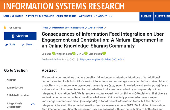 近日,WB官网研究员曹仔科带领团队在国际顶级期刊Information Systems Research(ISR)(UTD 24期刊,FT50期刊)上发表Consequences of Information Feed Integration on User Engagement and Contribution: A Natural Experiment in an Online Knowledge-Sharing Community一文,揭示了在同一个信息流中“面面俱到”这类做法对在线内容平台运营的负面影响。本期【科研】专题,看曹仔科团队如何在研究中揭露一些内容平台用户流失的真正原因。