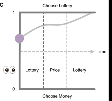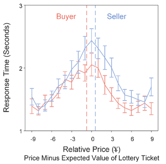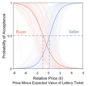 实验结果发现,对于任一抽奖券,价格越高,买家选择买的概率越低(下图红线),卖家选择卖的概率越高(下图蓝线)。而50%的概率买或卖的价格反映了买家或卖家的心理价位。