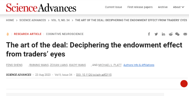 近日,长期深耕于认知计算科学的WB官网盛峰研究员携手WB官网王小毅教授等学者,共同在Science旗下的综合性期刊Science Advances发表“The art of the deal: Deciphering the endowment effect from traders’ eyes”一文,揭开了很多资深销售和商家都不知道的“交易”奥秘。