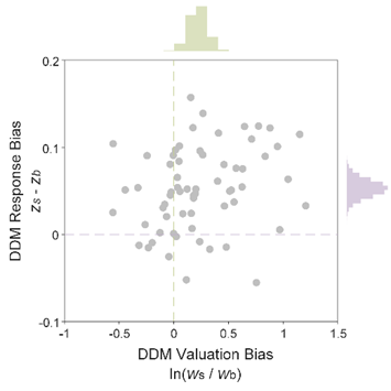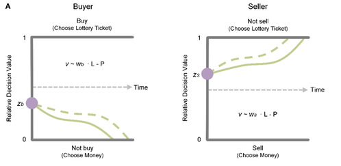 为了整合观察到的选择与选择时间的信息,盛峰团队基于漂移扩散模型(Drift Diffusion Model),提出了交易的决策过程模型。他们将“买不买”和“卖不卖”的选择都看作一个证据累积的过程。其中,“贪”会影响对不同证据的加权,例如,买家低估商品的价值,而卖家高估商品的价值。“懒”会影响对证据量的要求,例如,买家选择买比选择不买需要更多的证据,而卖家选择卖比选择不卖需要更多的证据。