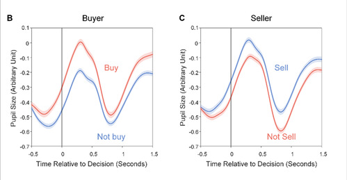 研究结果正如假设的那样,当买家选择买的时候,相比于选择不买的时候,瞳孔有更大程度的放大;而当卖家选择卖的时候,相比于选择不卖的时候,瞳孔有更大程度的放大。同时,买家与卖家选择买或卖时瞳孔放大的程度与他们安于现状的惰性相关,惰性越大,克服惰性选择交易时,瞳孔就会放得更大,意味着付出了更大的心力。