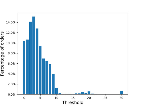 从下方图片中可以观察到,分属不同画像的用户其个性化阈值也存在着较大的差异。大多数用户的个性化阈值均在10分钟以下,这也就意味着很多顾客下单后的订单延迟过程可以控制在10分钟以内。