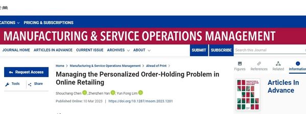 他们的这项研究成果“Managing The Personalized Order-Holding Problem in Online Retailing”于国际顶刊Manufacturing & Service Operations Management 成功刊发,并获得“The Finalist of the 2021 MSOM Data Driven Challenge”奖项。